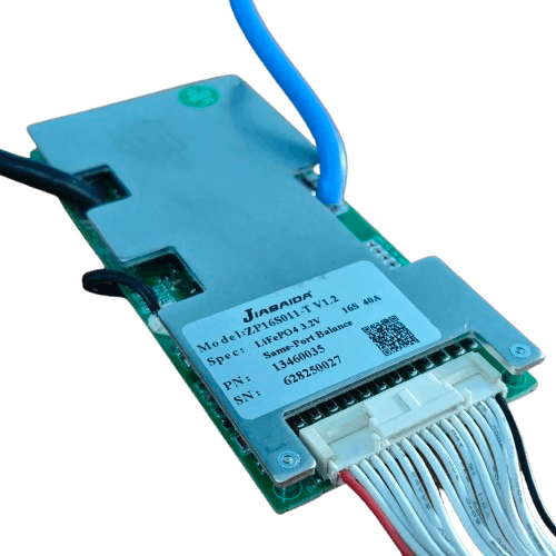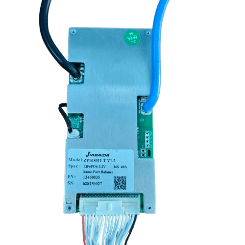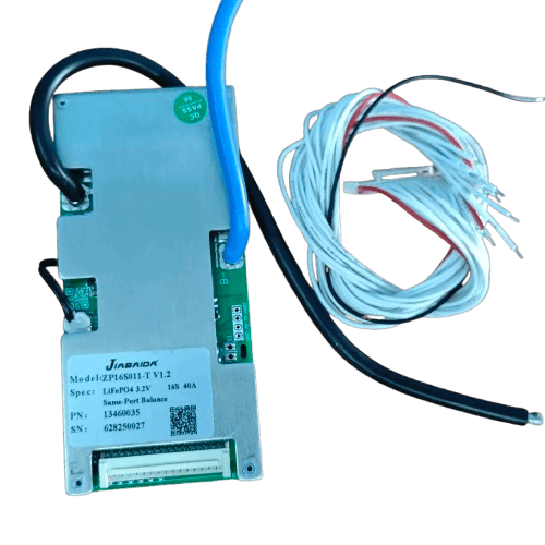 The JBD ZP16S011 16S 40A BMS is a lithium battery management system designed for 16-series LiFePO4 battery packs (48V/51.2V systems). It provides protection, cell balancing, and monitoring to ensure safe operation and longer battery life. The BMS supports 40A continuous discharge current and includes multiple safety protections such as over-charge, over-discharge, short circuit, and temperature protection. It is widely used in solar storage batteries, e-bikes, e-rickshaws, UPS, and DIY lithium battery packs.
