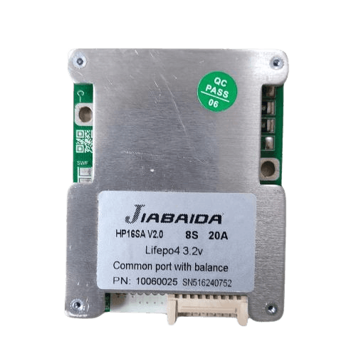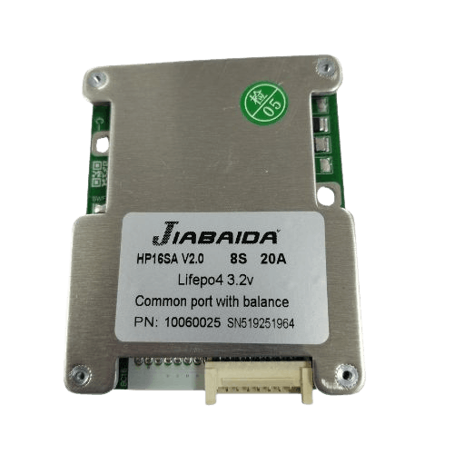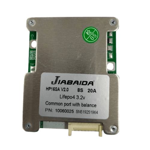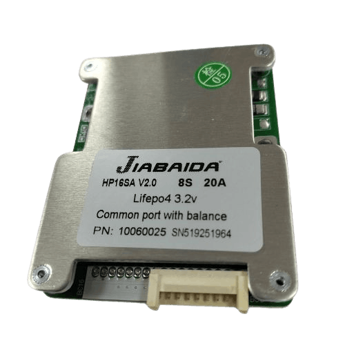 The JBD HP16SA 8S 20A BMS is a compact and reliable battery protection board designed for 8-series LiFePO4 battery packs with a nominal voltage of 25.6V. It monitors the voltage of each individual cell, the battery current, and temperature to maintain safe operation and extend the life of the battery pack.