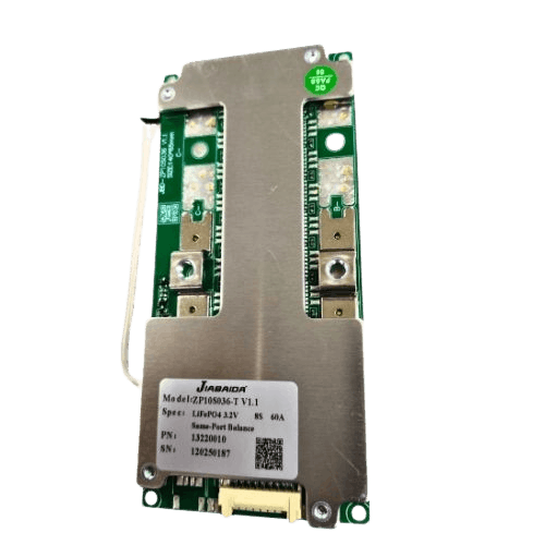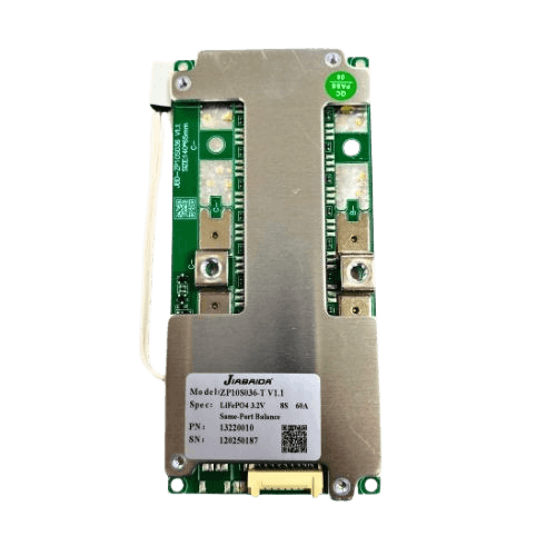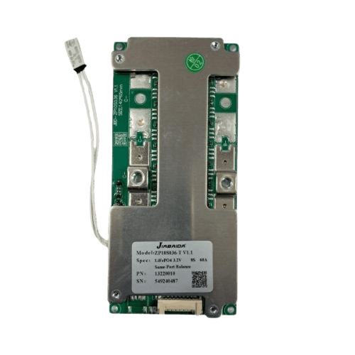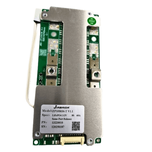 The JBD ZP10S036 8S 60A BMS is a robust hardware Battery Management System tailored for 8S (25.6 V) LiFePO₄ (LFP) battery packs. Its primary function is to protect and manage the battery pack by continuously monitoring cell voltages, total voltage, current and temperature, ensuring the battery operates safely under varied load conditions.